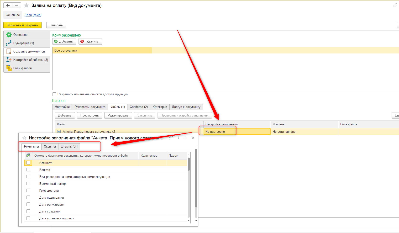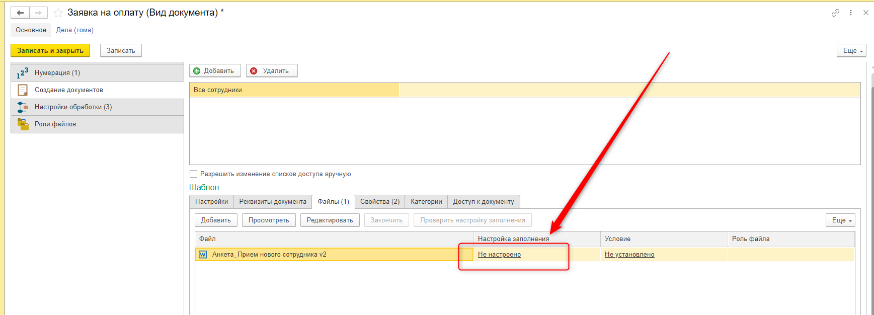Для создания нового вида документа легко добавить соответствующий шаблон и задать параметры автоматического заполнения файлов. Это можно сделать в удобной карточке вида документа, перейдя на специальную вкладку "Создание документов".