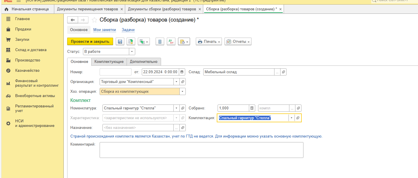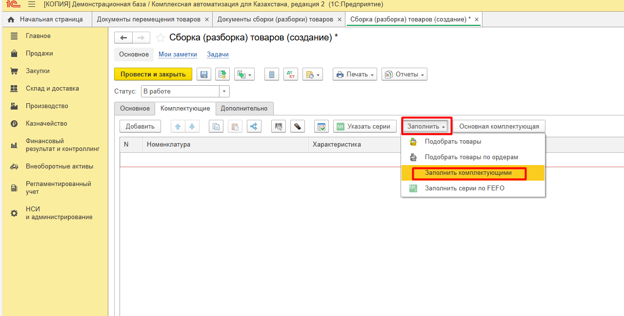 Заполняем собираемый комплект, организацию, склад, комплектацию (если она создана для комплекта).