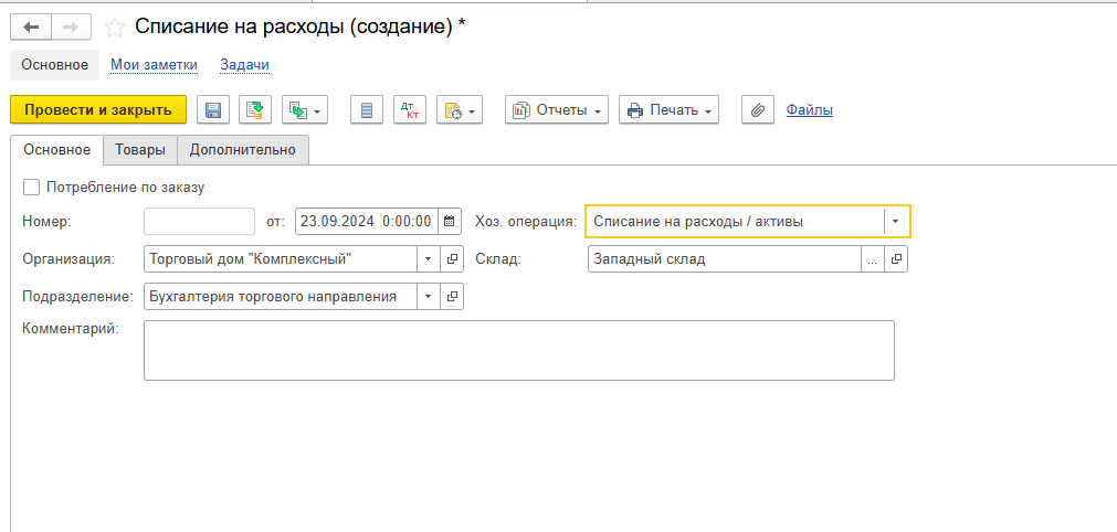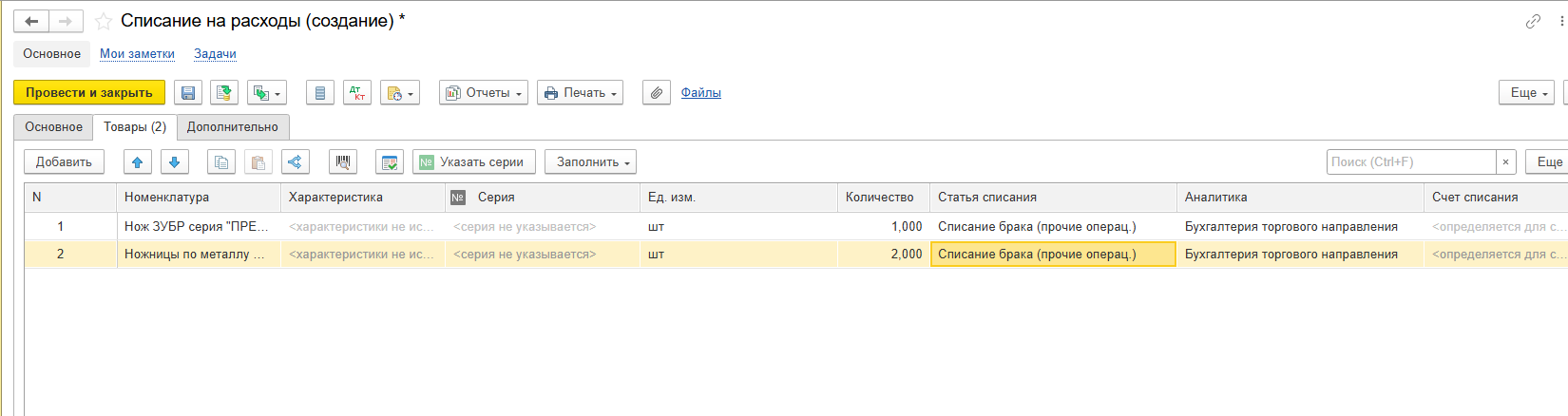 Теперь заполняем списываемые ТМЦ, проводим документ.