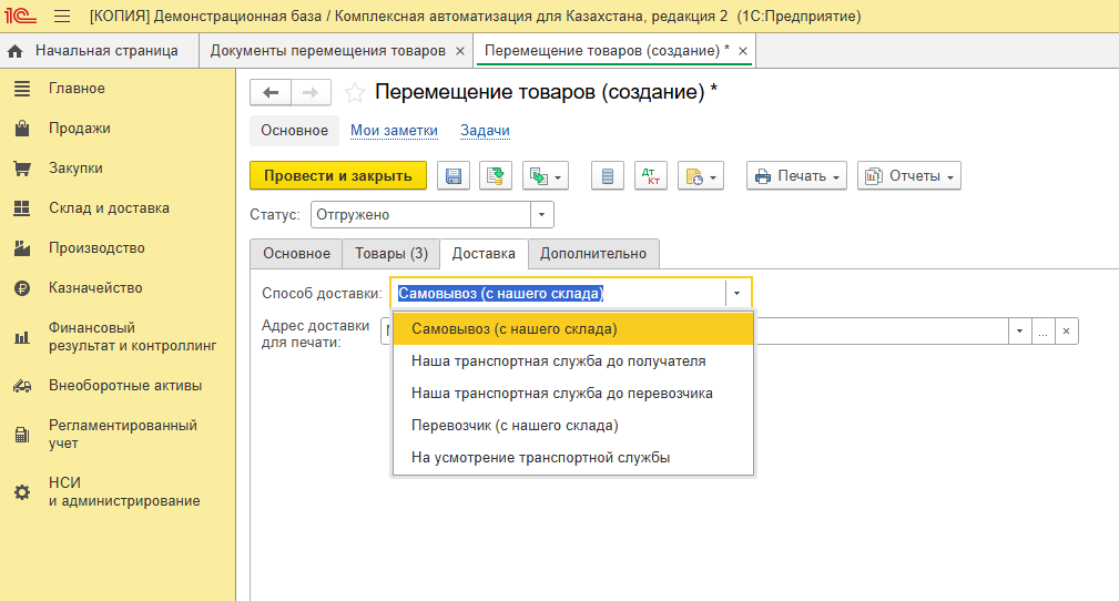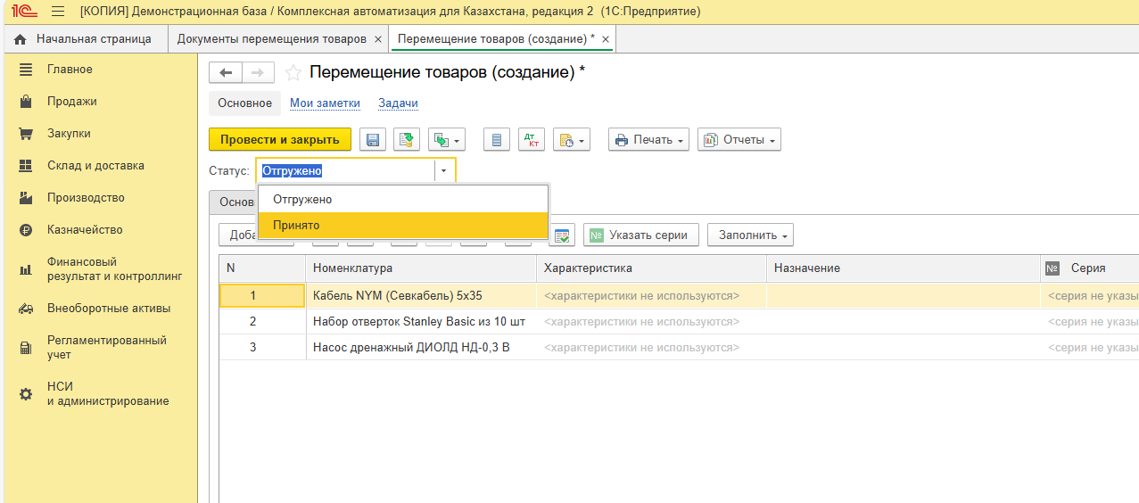 Проводим документ. Обратите внимание, что ТМЦ поступит на склад-получатель только при проведении документа в статусе Принят.