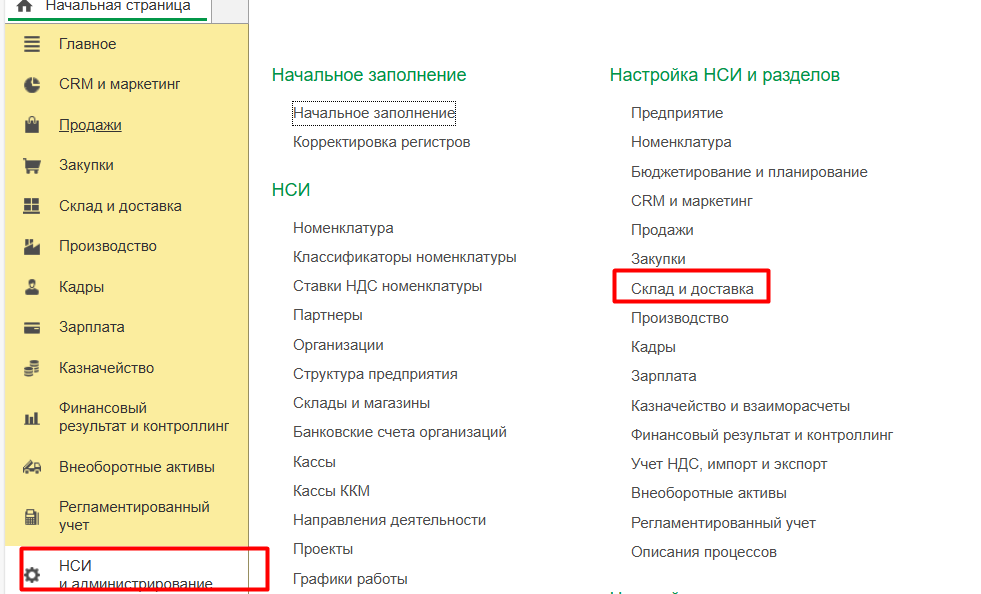 Открываем настройки подсистемы склада, где видим следующие основные настройки, которые касаются складских операций: