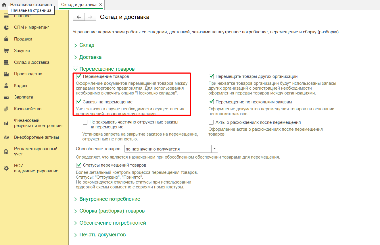 • Перемещение товаров – данная опция позволяет регистрировать операцию перемещения ТМЦ между складами. Также можно включить возможность использования заказов перемещения, с помощью которых можно планировать осуществление перемещений;