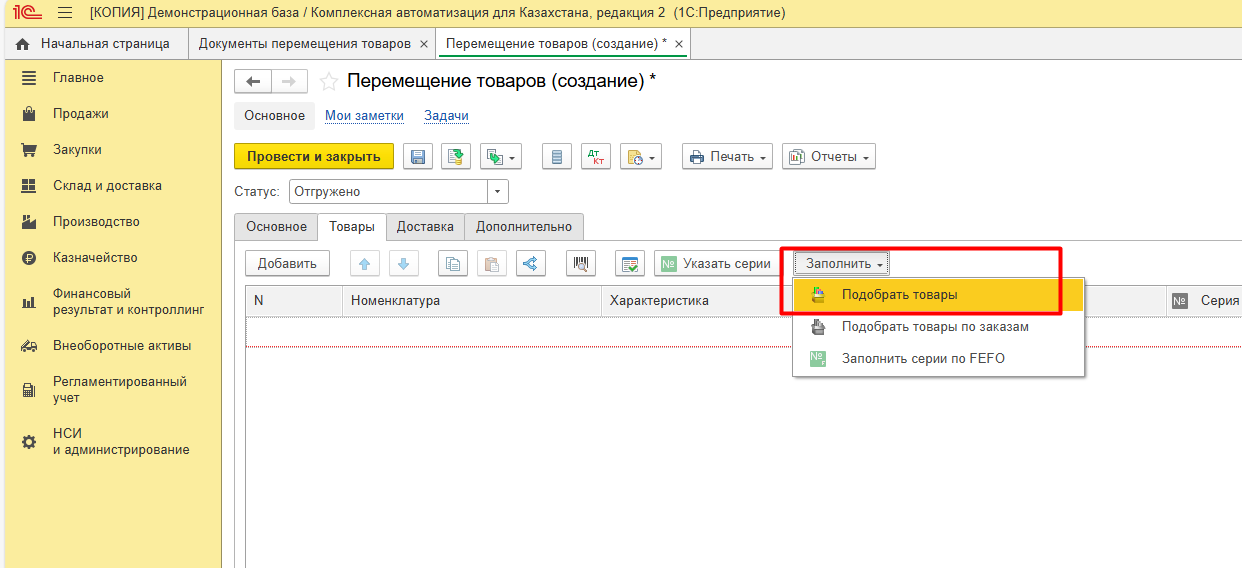 Перемещение товаров, заполнить