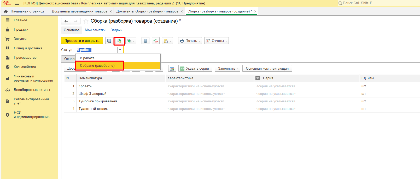 Для регистрации сборки устанавливаем конечный статус и проводим документ.