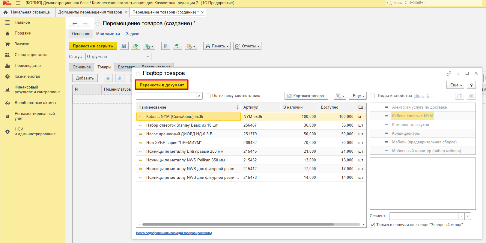 Выбираем ТМЦ и переносим их в документ.