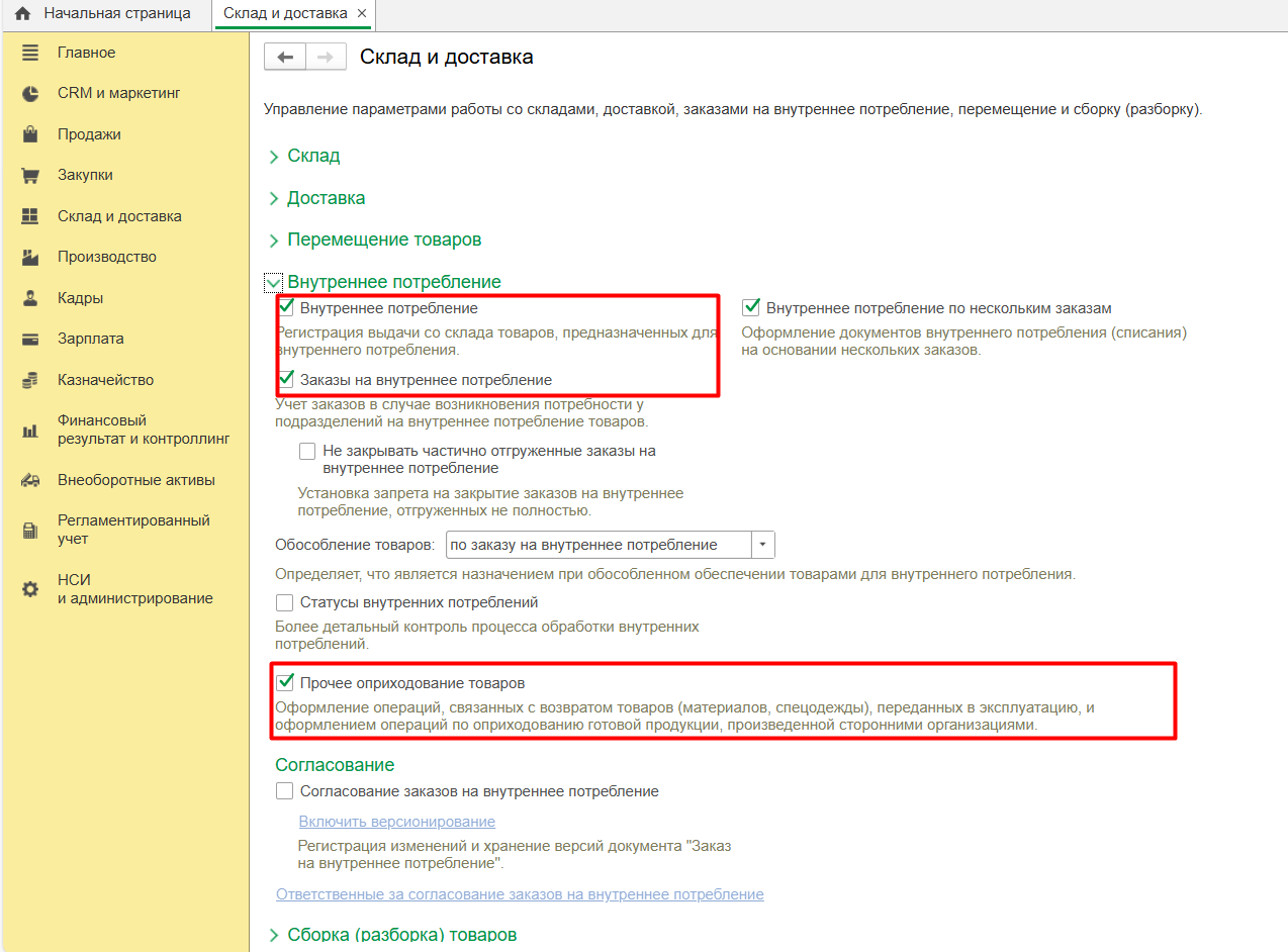 • Внутреннее потребление – данная опция позволяет регистрировать операцию списания ТМЦ на внутренние нужды, а также передавать ТМЦ в эксплуатацию. Также можно включить возможность использования заказов на внутреннее потребление, с помощью которых можно планировать осуществление списания, передач в эксплуатацию;
