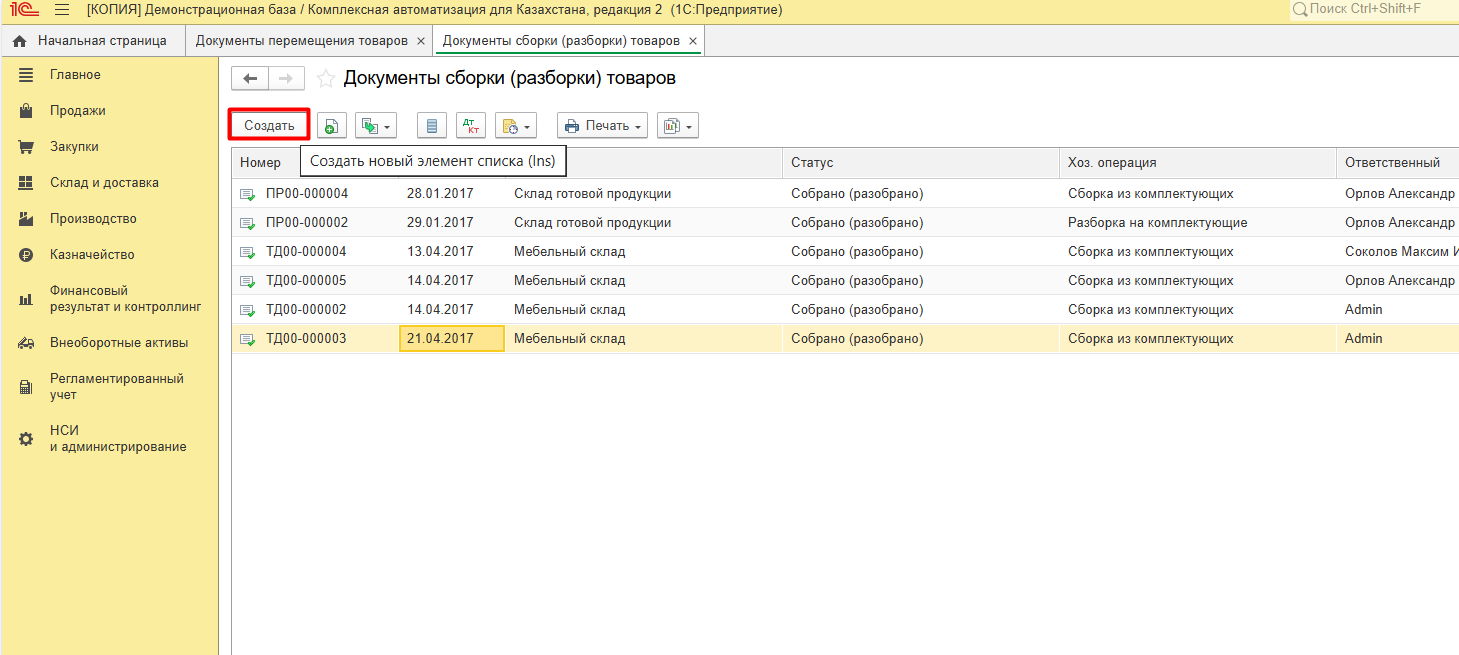 Документы сборки (разборки) товаров, Создать