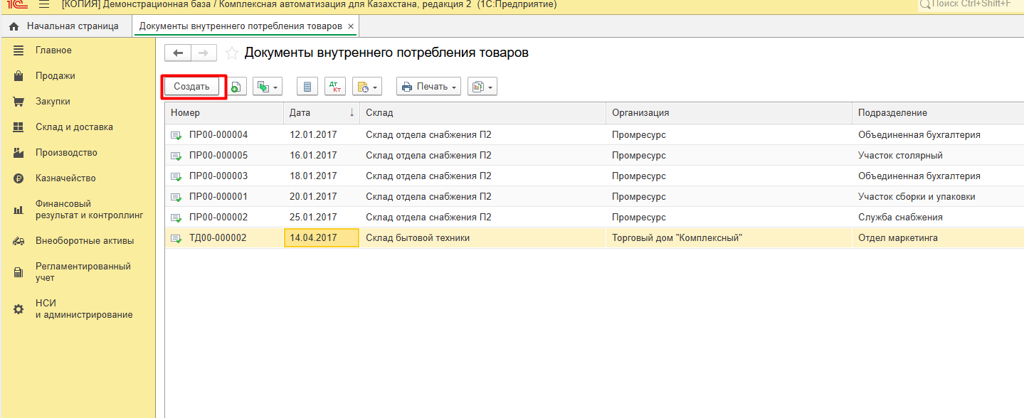 Теперь переходим к регистрации списания ТМЦ на внутренние нужды. Для этого открываем журнал документов внутреннего потребления и создаем новый документ.