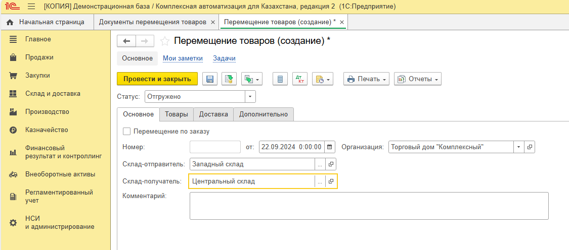 Заполняем склады (отправителя и получателя), а также организацию.