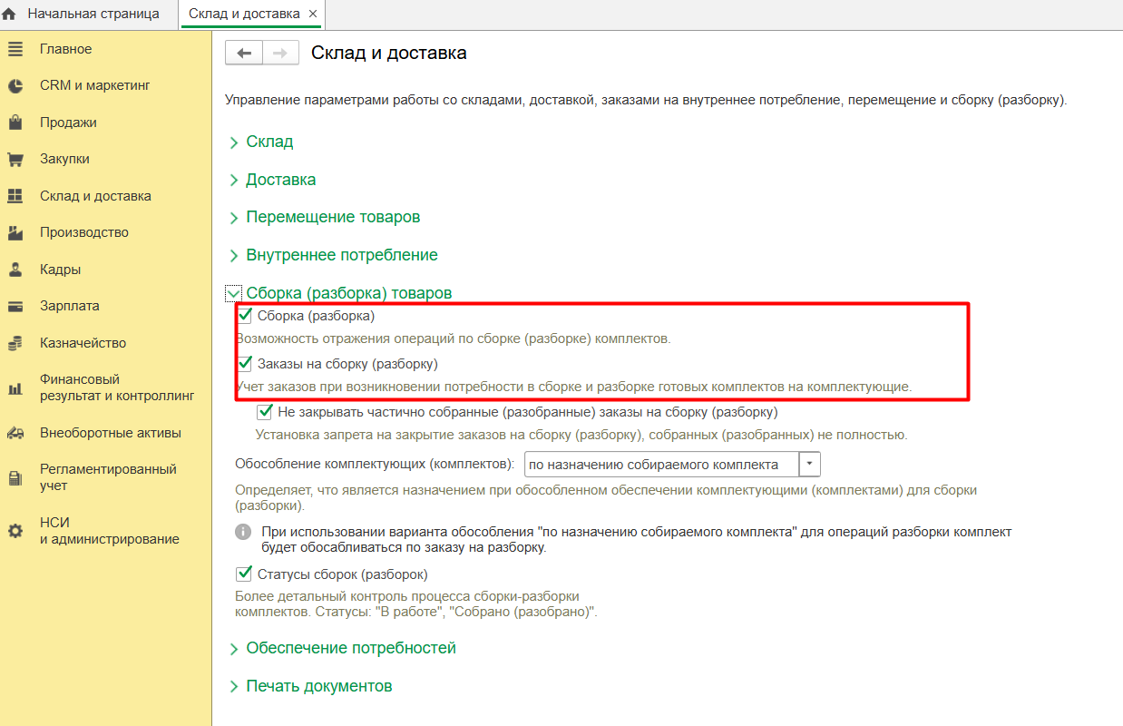 • Сборка товаров – данная опция позволяет регистрировать операцию сборки и разборки комплектаций. Также можно включить возможность использования заказов на сборку и разборку, с помощью которых можно планировать осуществление сборок и разборок.