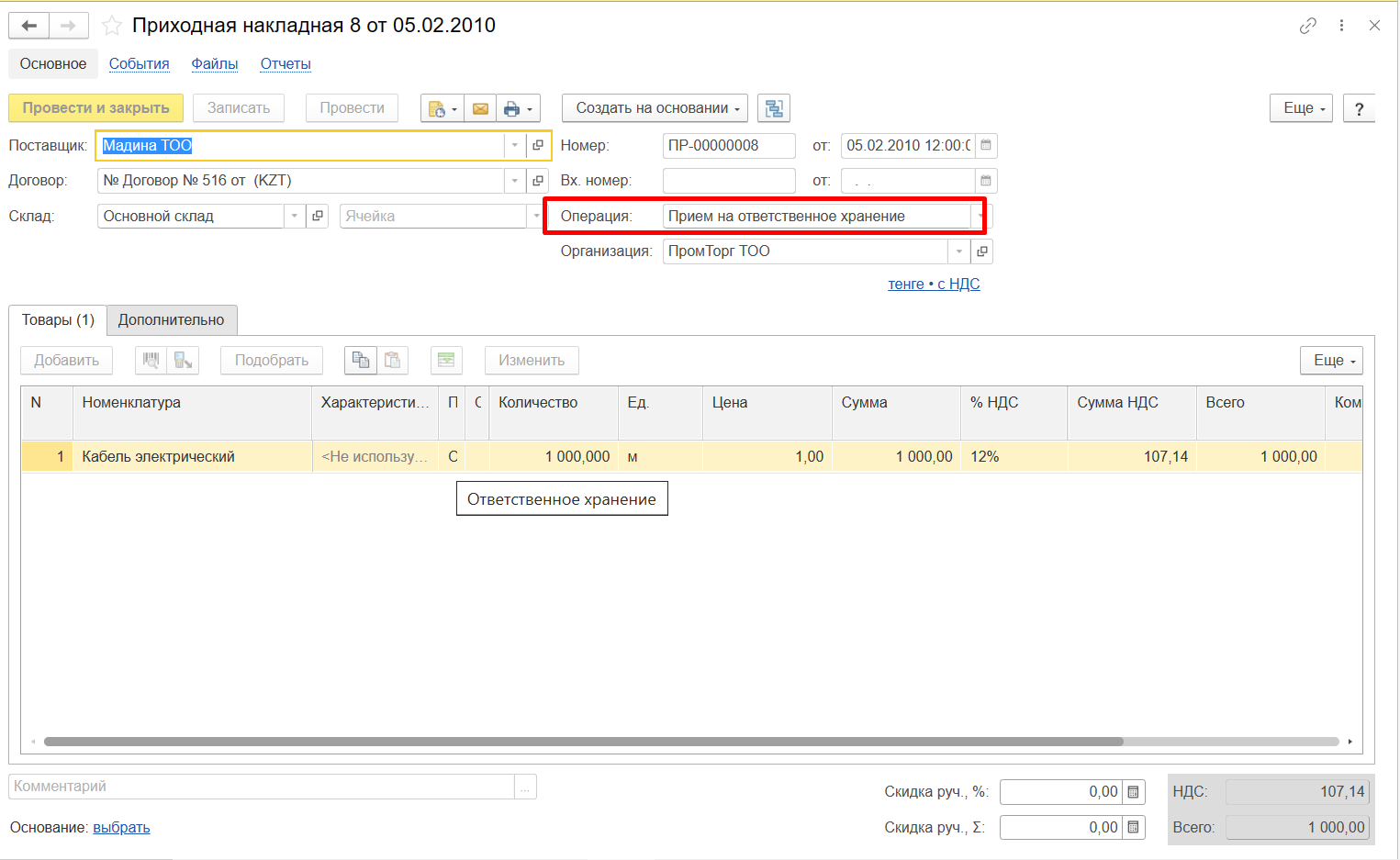 Данный документ используется для регистрации приемки товаров от стороннего контрагента на ответственное хранение.