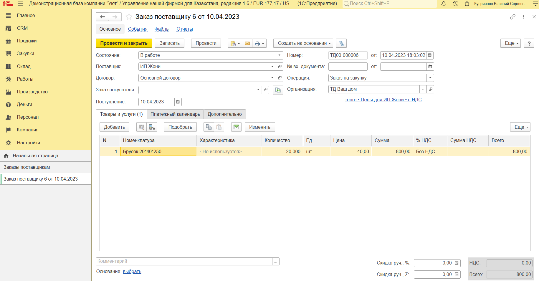 1. Функция документа Заказ поставщику в 1С УНФ для Казахстана