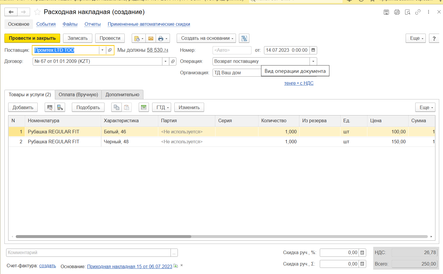 3. Каким документом оформляется накладная на возврат товаров поставщику в 1С: УНФ для Казахстана
