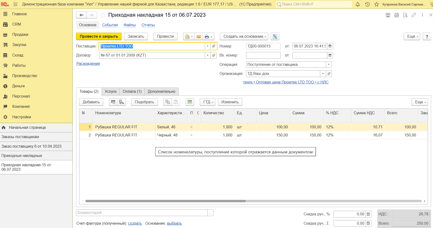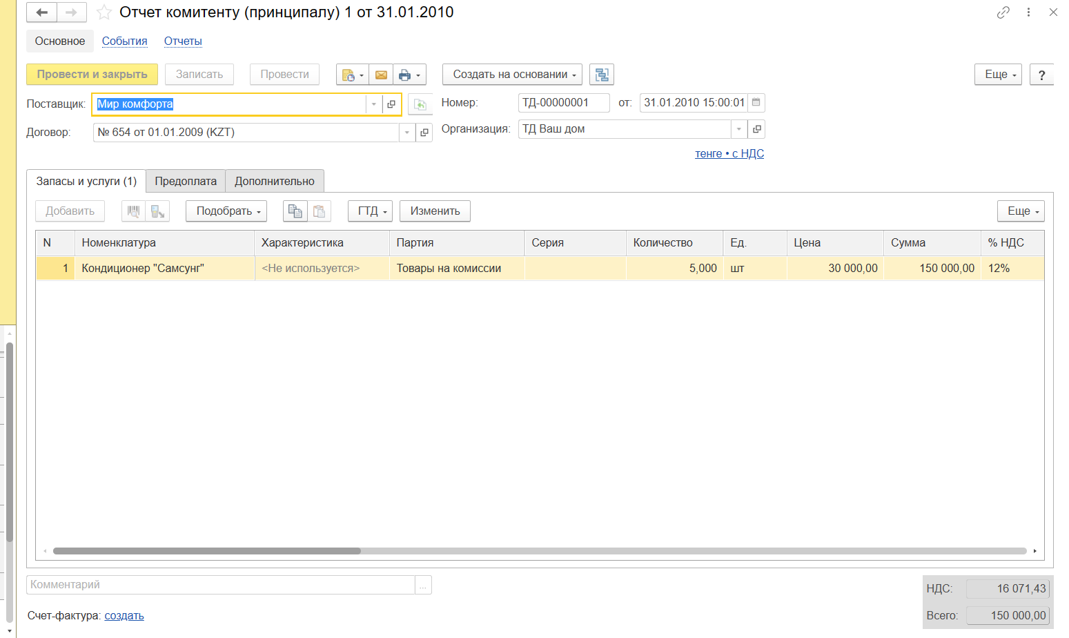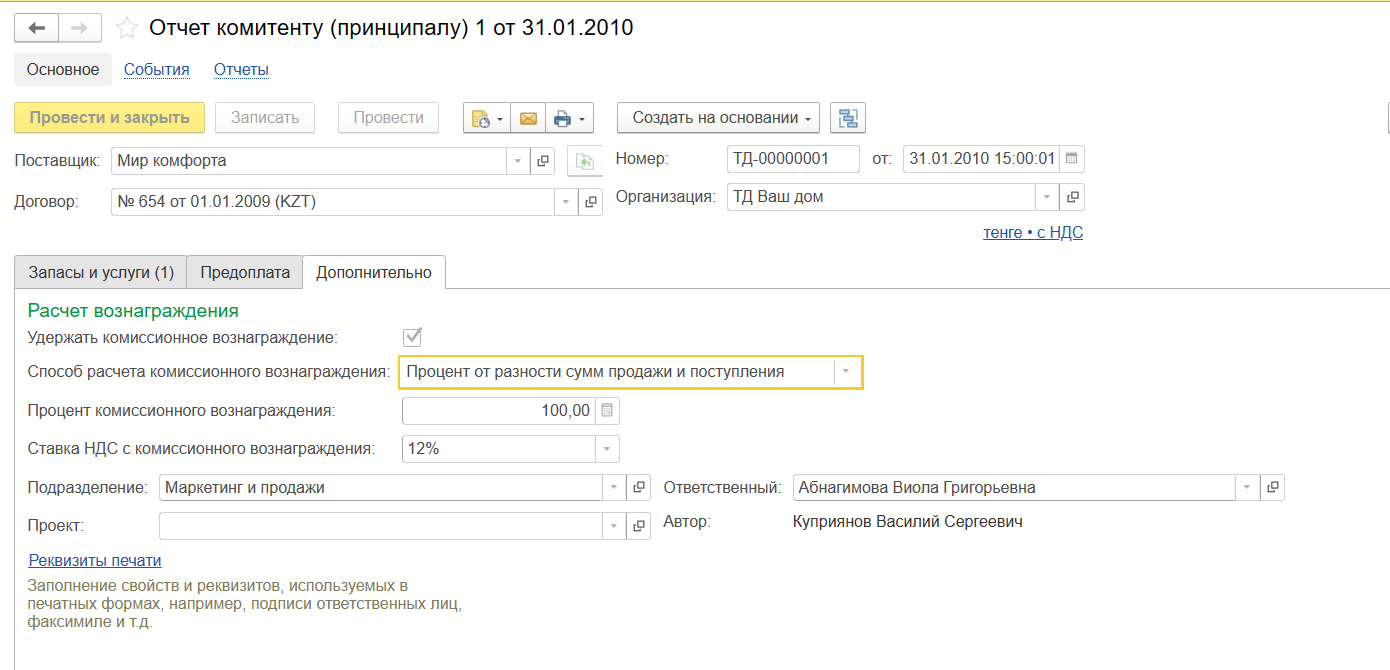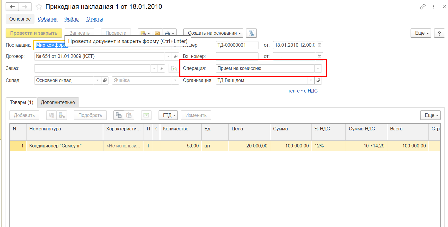 5. Прием товаров на комиссию в 1С: УНФ для Казахстана