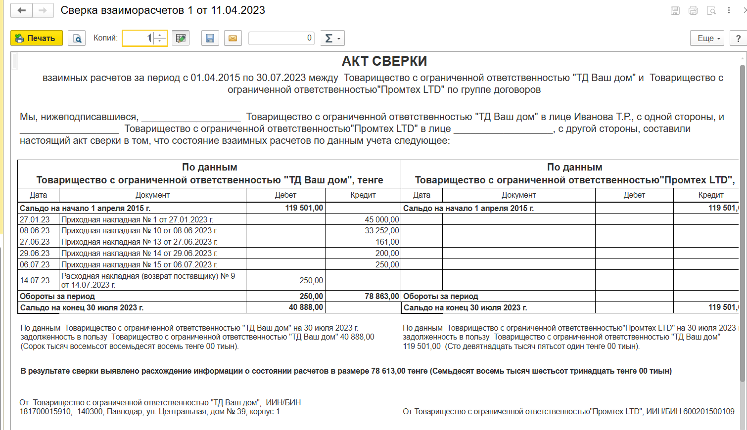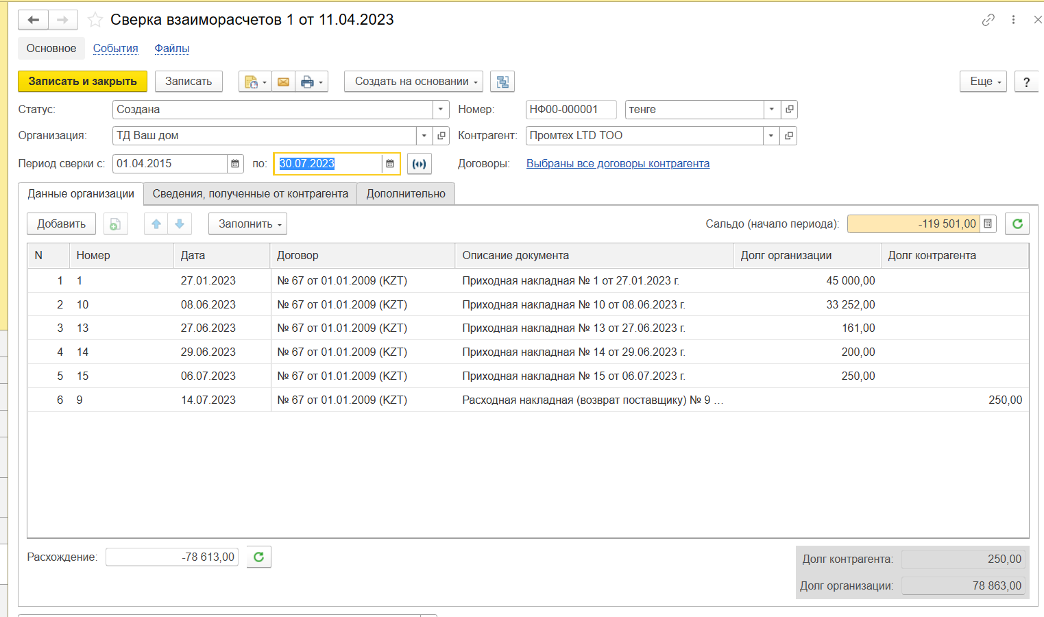 В 1С: Предприятие УНФ есть возможность оформить акт сверки. Данная операция выполняется для контроля и сверки взаиморасчетов с контрагентом. В документе заполняются документы, формирующие задолженность и документы оплаты.