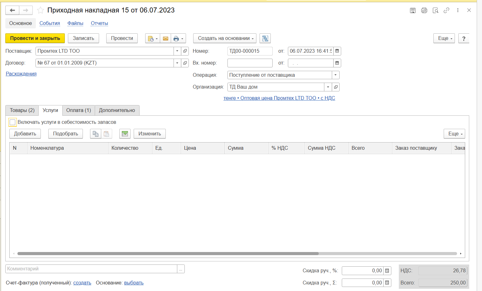 В документе можно указать услуги, которые можно распределить на себестоимость товаров из документа. Также документ можно создать вручную.