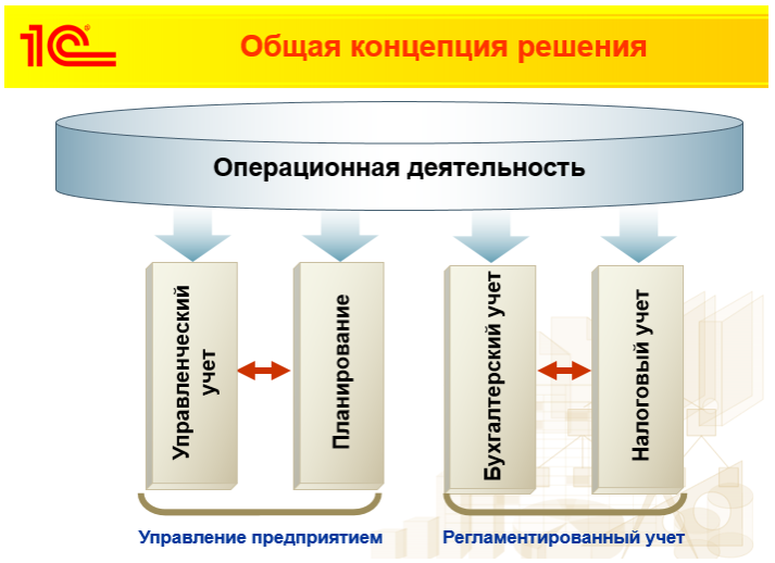 Все эти подсистемы можно объединить в некую общую структуру-концепцию данного прикладного решения на платформе 1С, которая продемонстрирована далее: