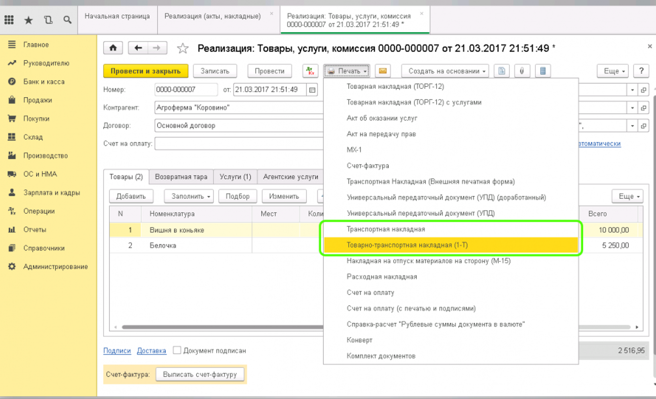 При этом в выпадающем меню необходимо выбрать «Товарно-транспортная накладная»: