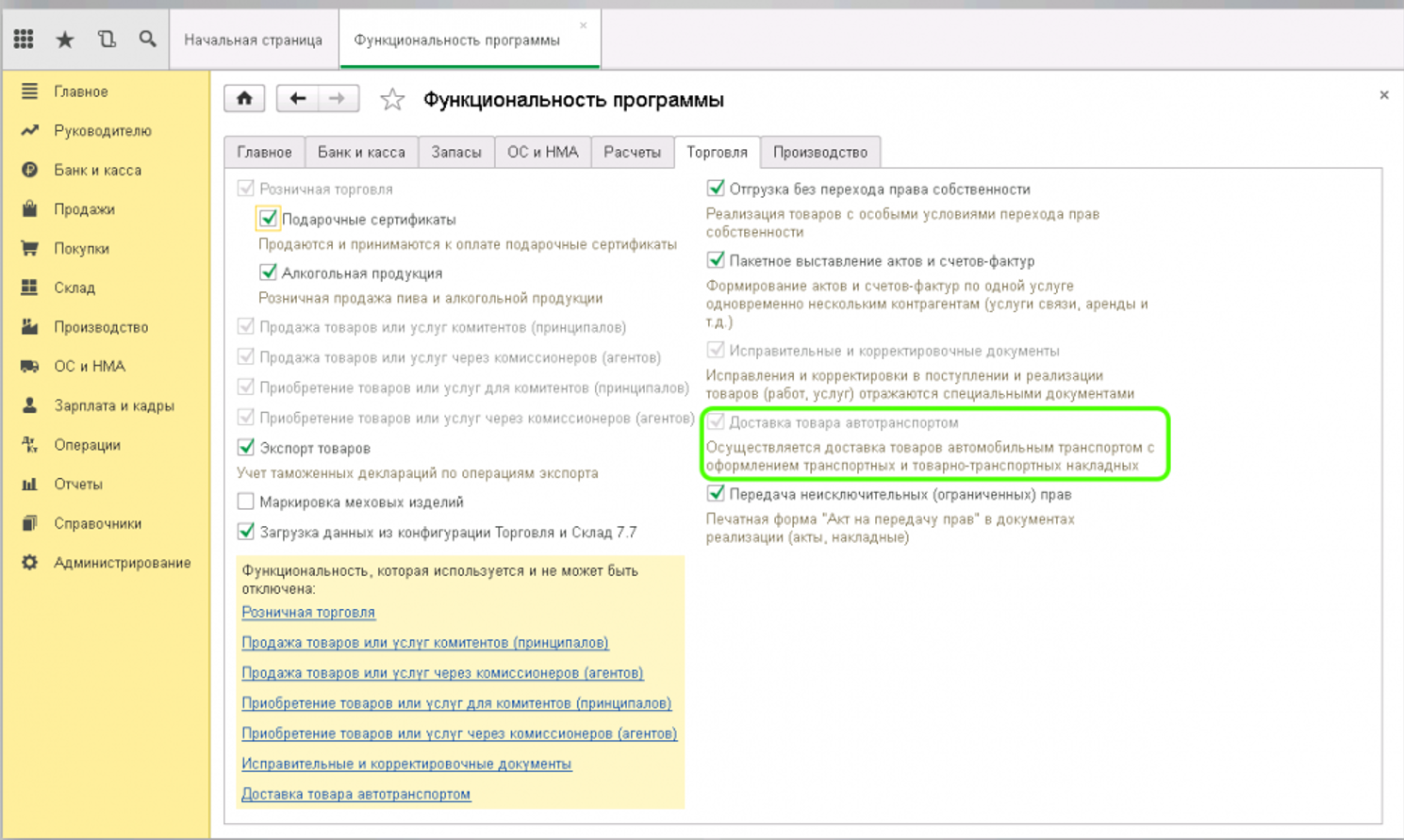 3. Устанавливаем чек-бокс «Доставка товара автотранспортом»: