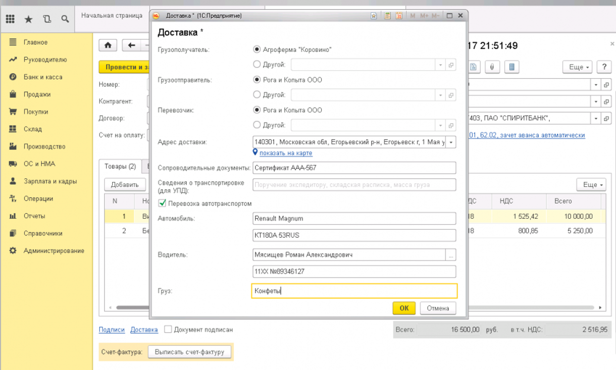 · грузополучатель. Стандартно указан такой же контрагент (в документе реализации), но можно выбрать и другого КА;