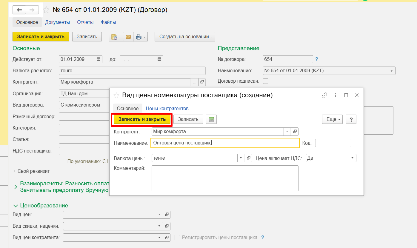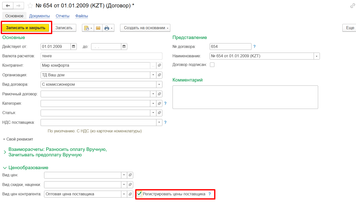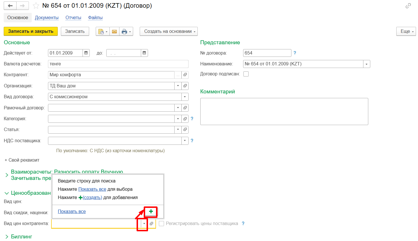 В блоке реквизитов Ценообразование необходимо заполнить вид цены контрагента. Не стоит путать вид цены продажи с видом цены поставщика. Это разные справочники. Про виды цен продажи можно прочитать в статье: Расчет цены в программе 1С: Управление нашей фирмой для Казахстана (koderline.kz).