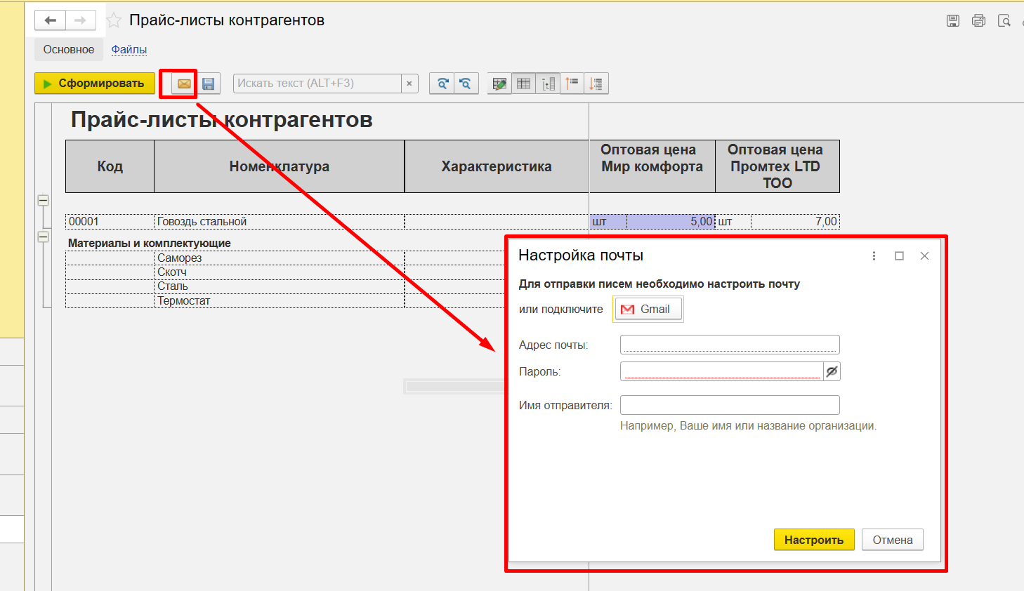 Также прайс-лист, как и любой другой отчет, можно отправить по электронной почте. Для этого в системе необходимо настроить электронную почту.