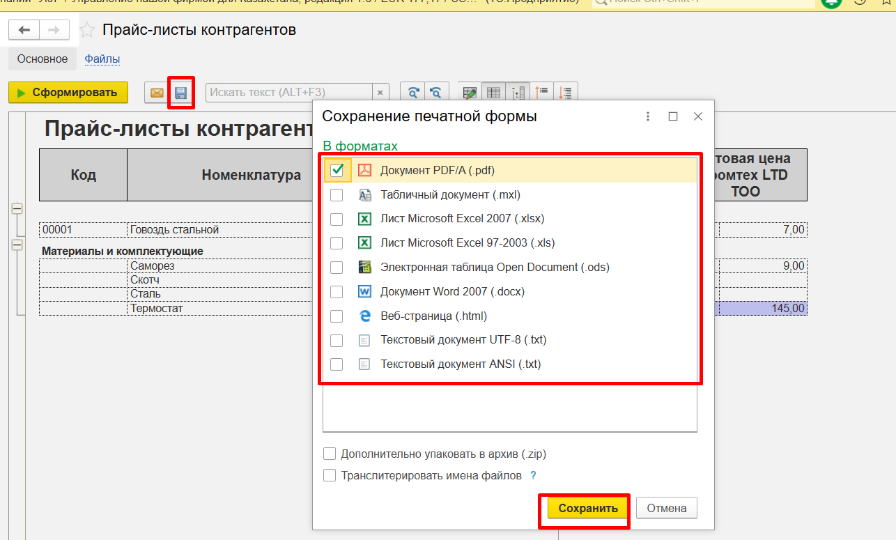 Прайс-лист можно сохранить на компьютер в любую из предложенных файловых форматов. Отправить электронным способом или распечатать.