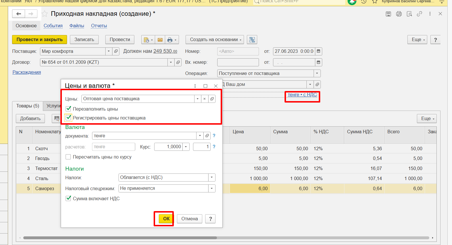 После заполнения вида цены поставщика появляется возможность установить флажок Регистрировать цены поставщика. Активируем данный флажок. В этом случае при проведении приходной накладной будут автоматически установлены цены, указанные в документе. Сохраняем и перевыбираем договор в приходной накладной УНФ.