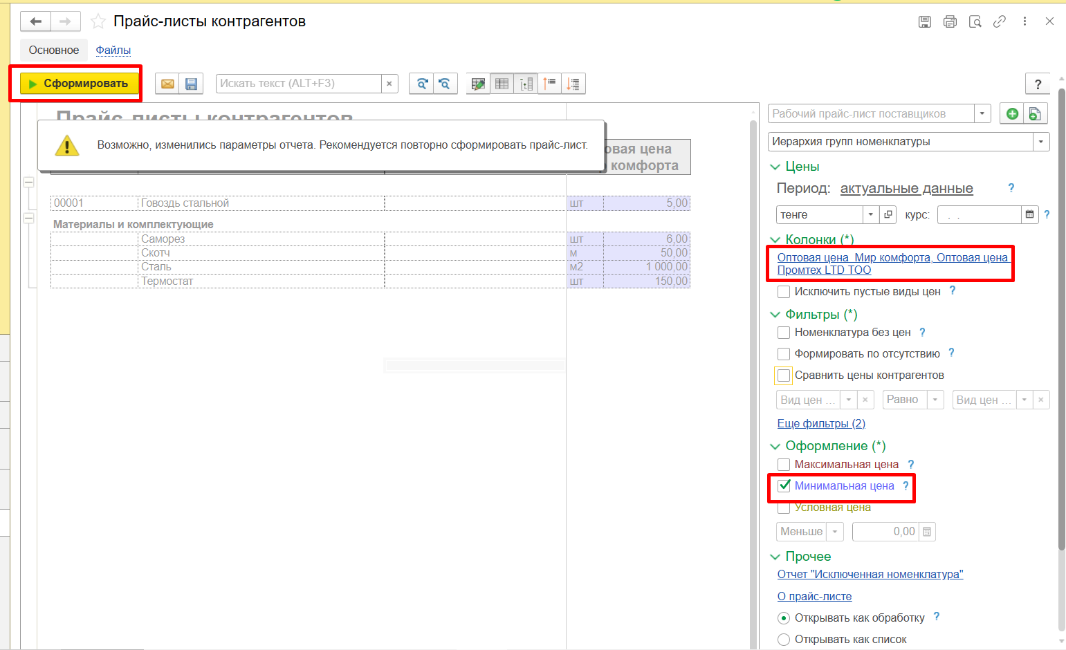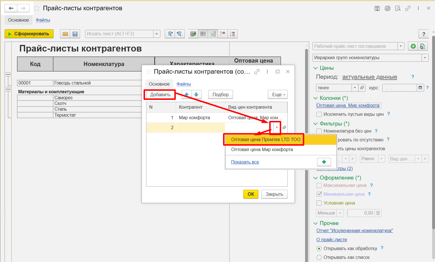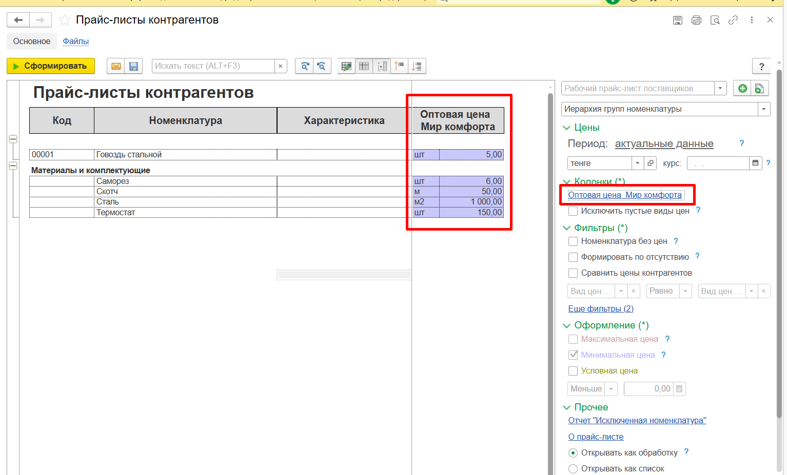 В настройках отчета, в колонках, выбираем виды цен поставщиков, по которым будет сформирован прайс.