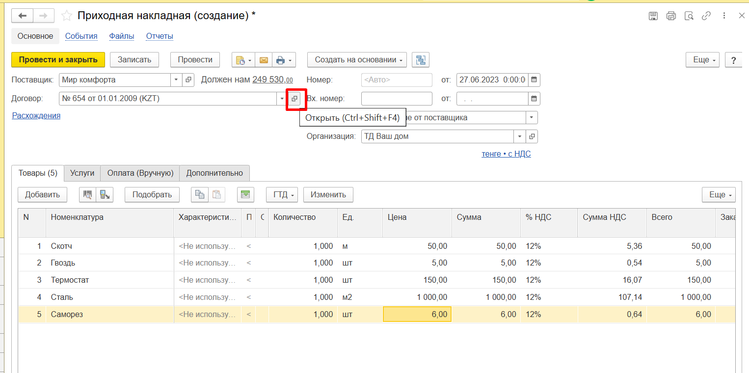 Создаем приходную накладную в 1С, заполняем документ. Более подробно о создании и заполнении приходной накладной можно почитать в статье: Поступление ТМЦ в программе 1С Управление нашей фирмой для Казахстана (koderline.kz).