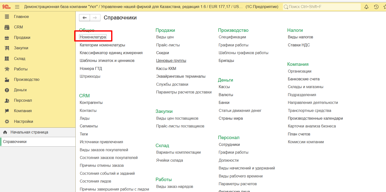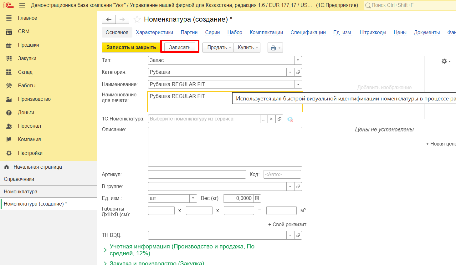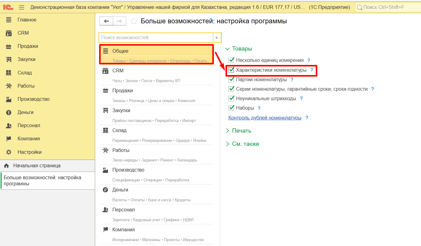 1. Настройка учета характеристик в конфигурации 1С: УНФ 1.6 для Казахстана