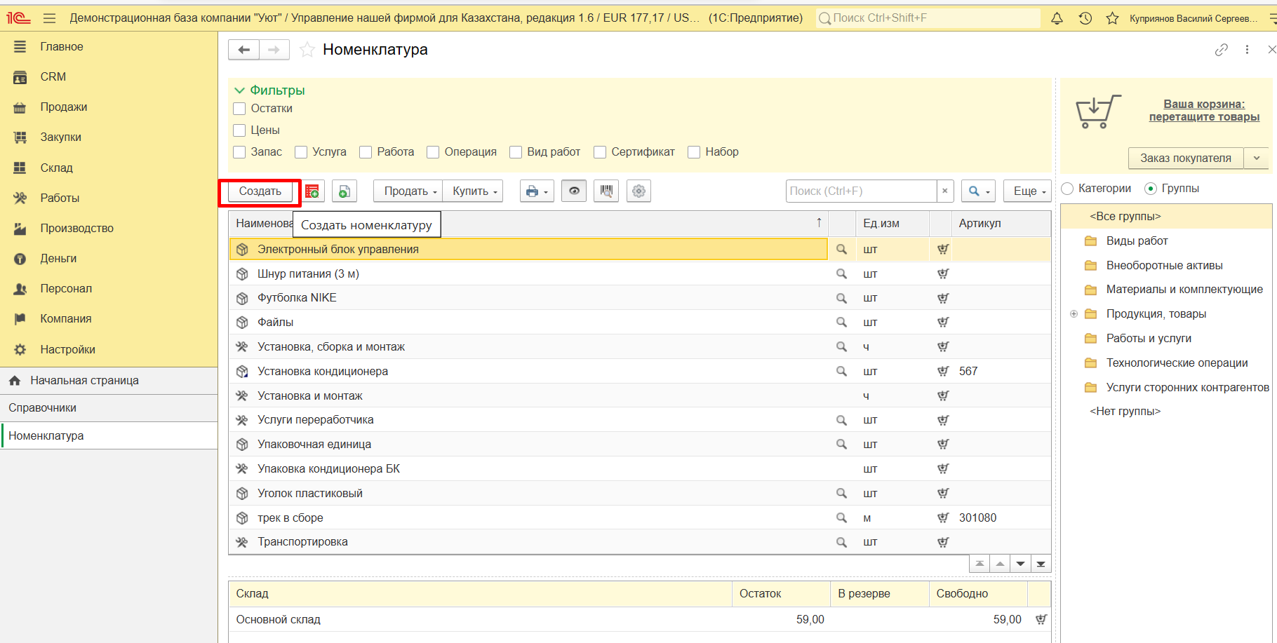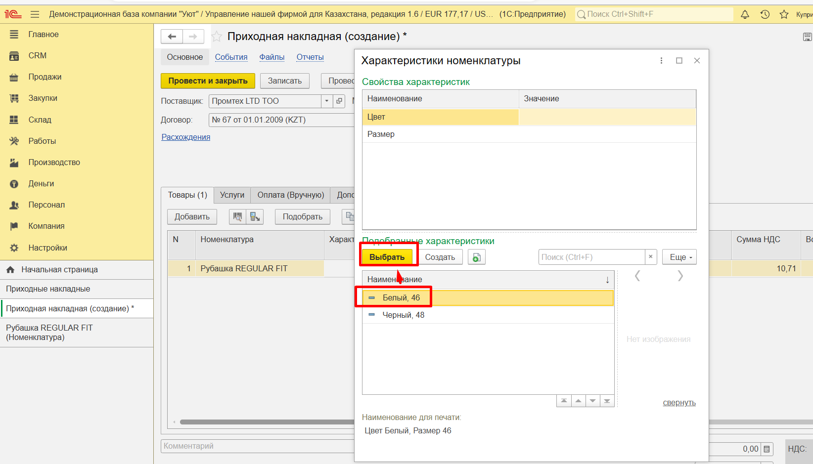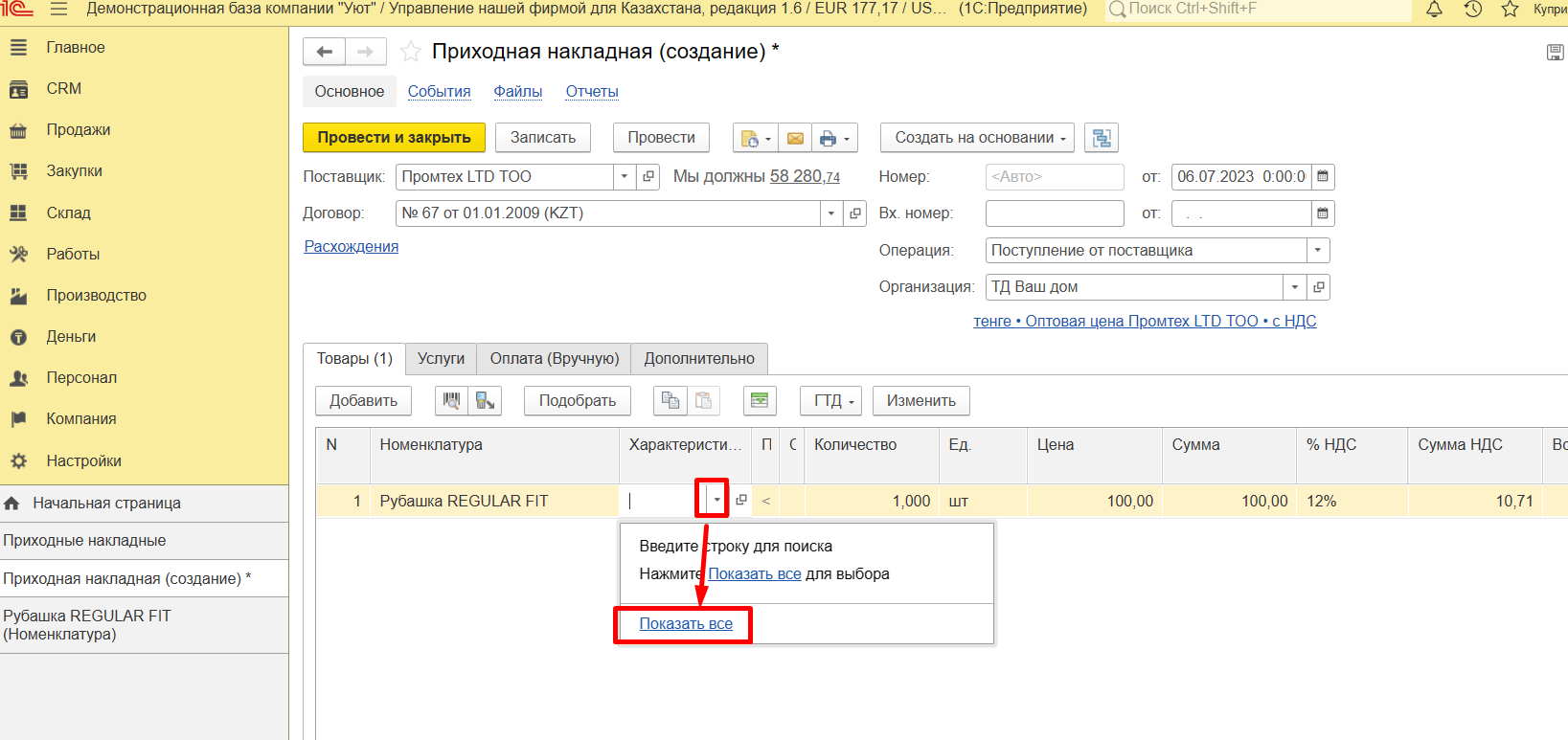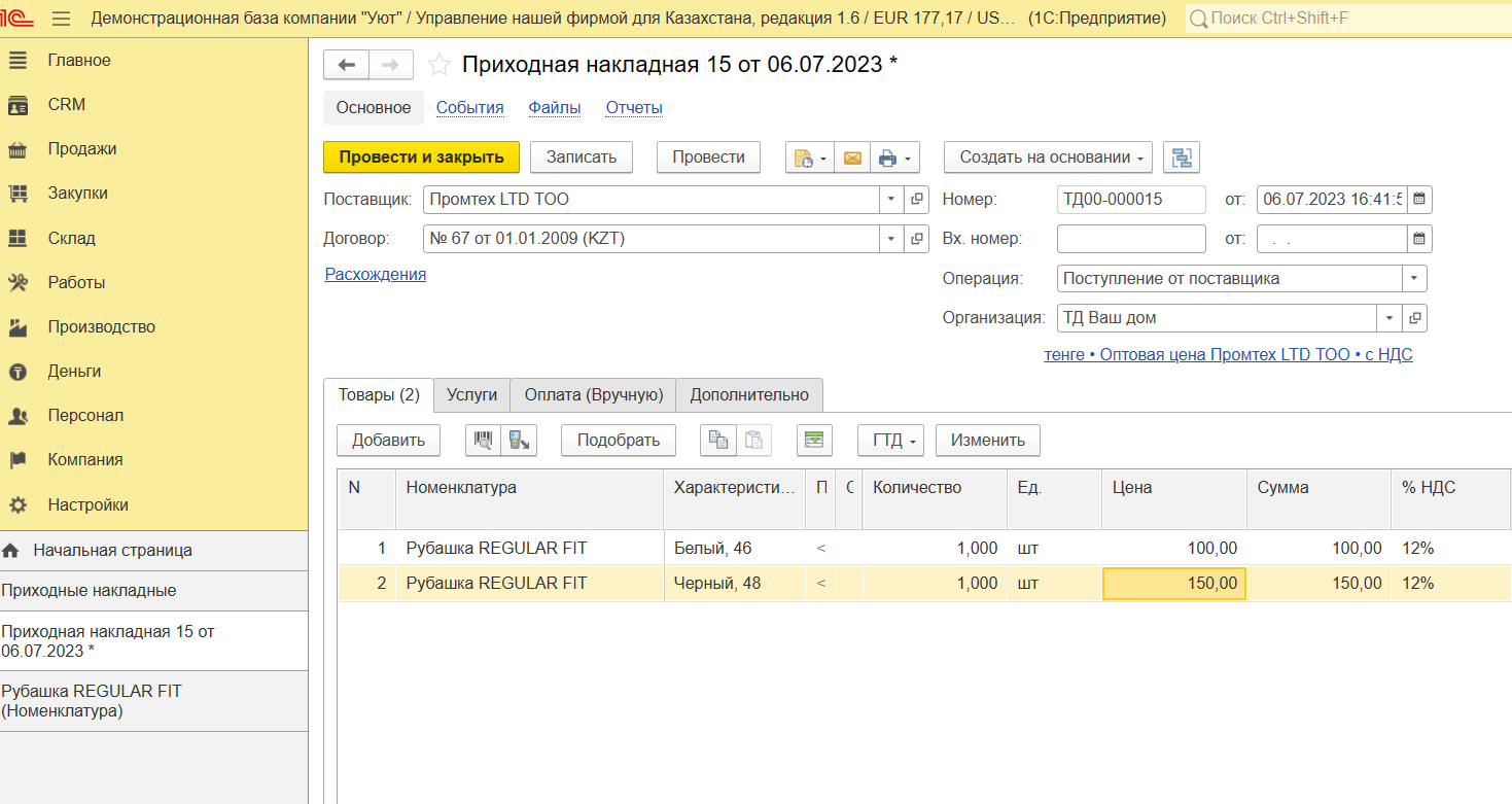 В приходной накладной заполняем основные данные и номенклатуру, которая ранее была создана.