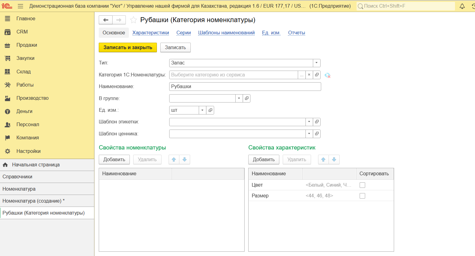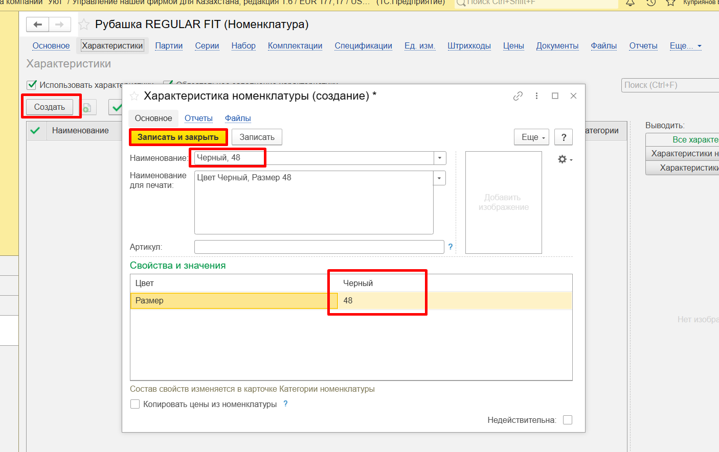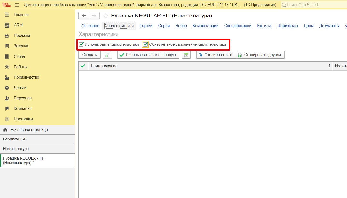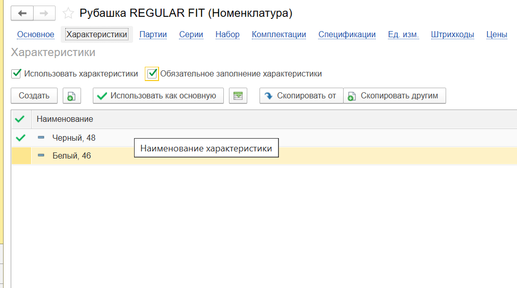 Для возможности создания характеристик для товара, в первую очередь нужно создать категорию номенклатуры. В категории создаются свойства характеристик. Свойствами характеристик являются, например, размер, материал, цвет. В самом свойстве создаются их значения.