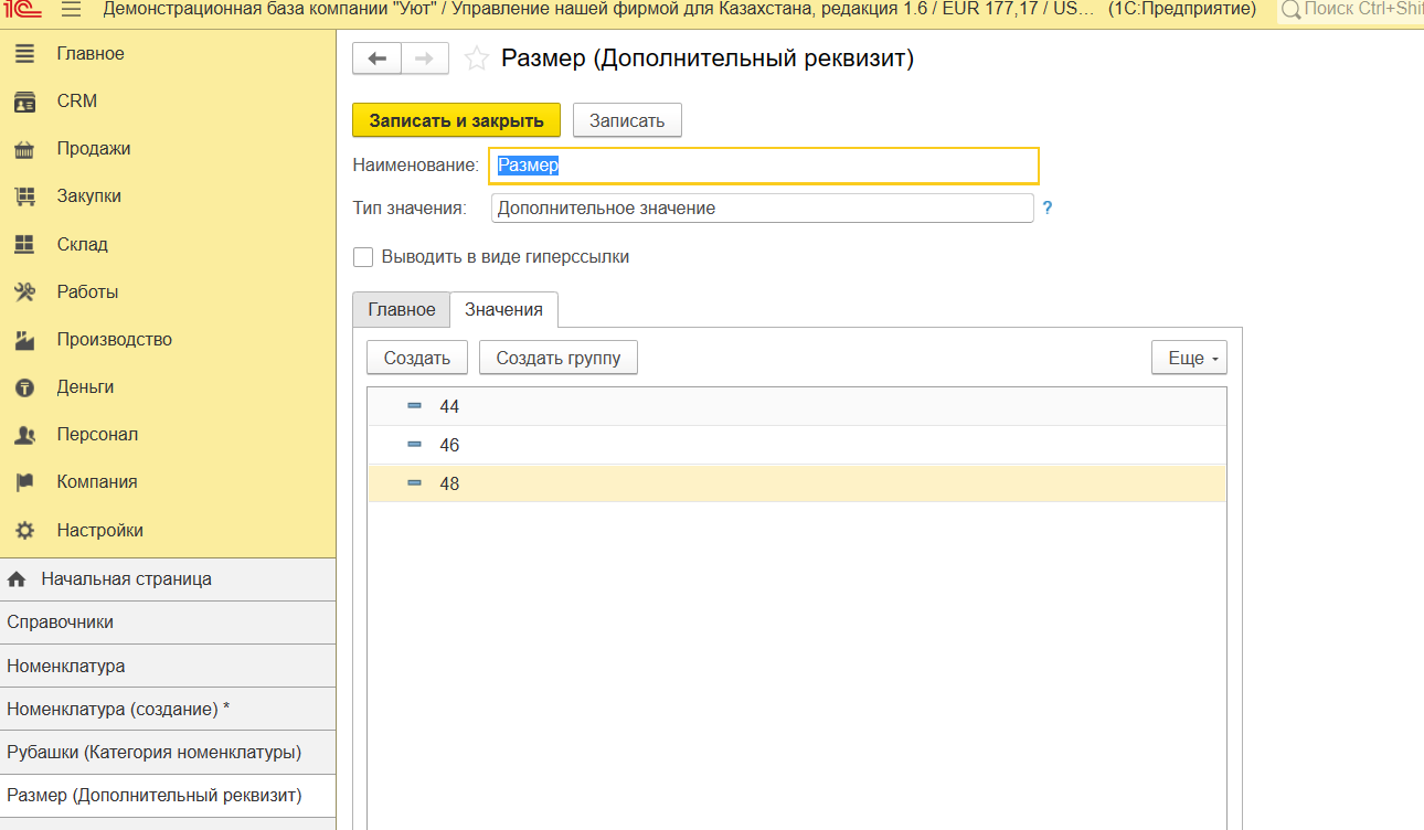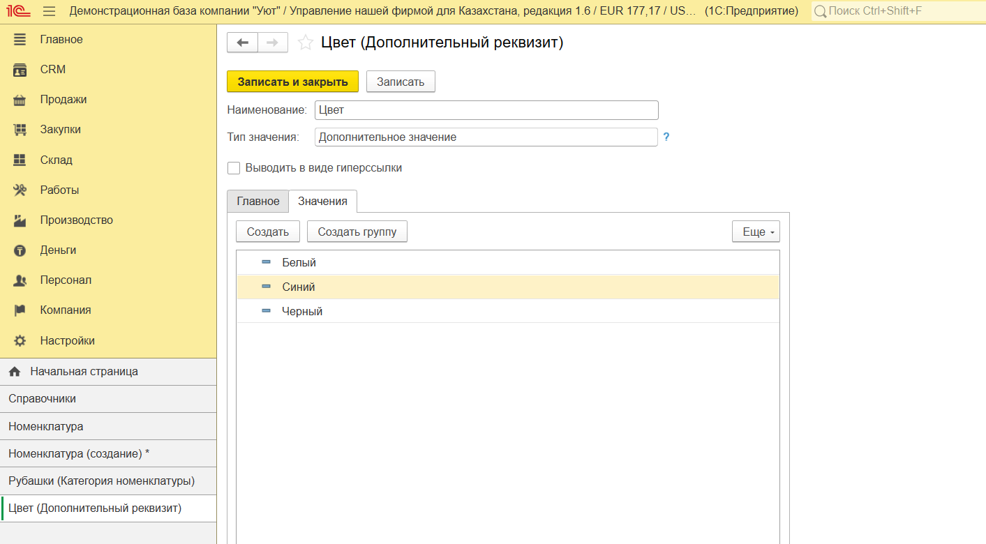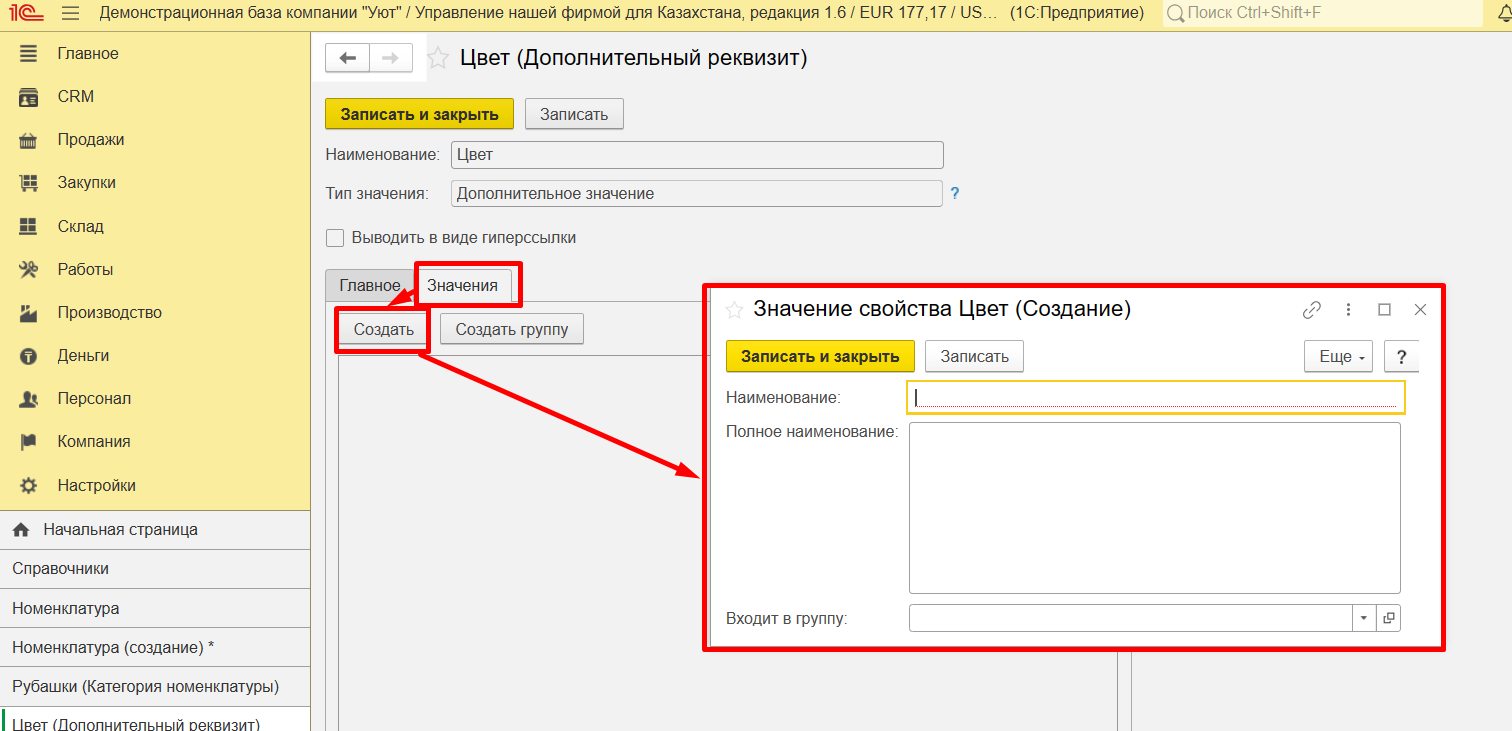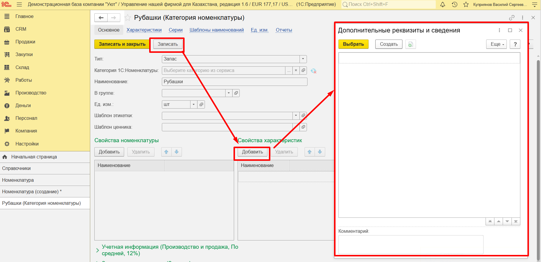 Для возможности создания характеристик для товара, в первую очередь нужно создать категорию номенклатуры. В категории создаются свойства характеристик. Свойствами характеристик являются, например, размер, материал, цвет. В самом свойстве создаются их значения.