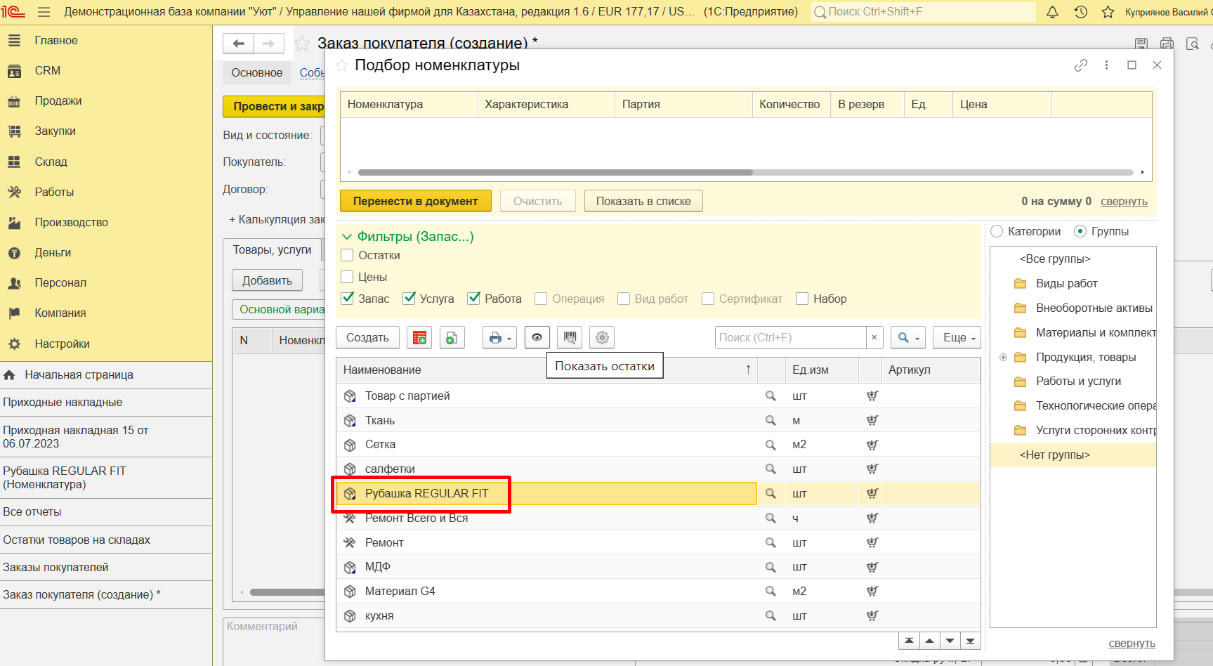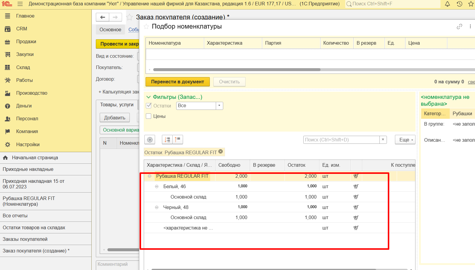 При продаже товаров, при подборе товара также нужно указывать характеристику товаров. Для этого щелкаем двойным щелчком мыши по товару и откроется список характеристик с остатками.