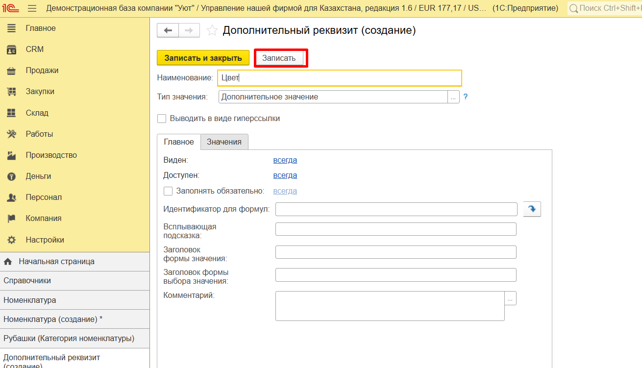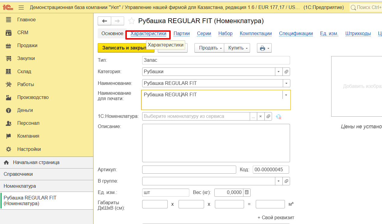 2. Как создать и заполнить характеристики номенклатуры в 1С: Управление нашей фирмой редакция 1.6 для Казахстана