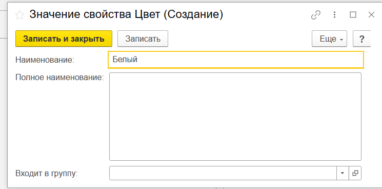 Указываем наименование, по умолчанию установлен тип значения Дополнительное значение, это значит, что для свойств можно создавать значения для свойств. Сохраняем свойство.