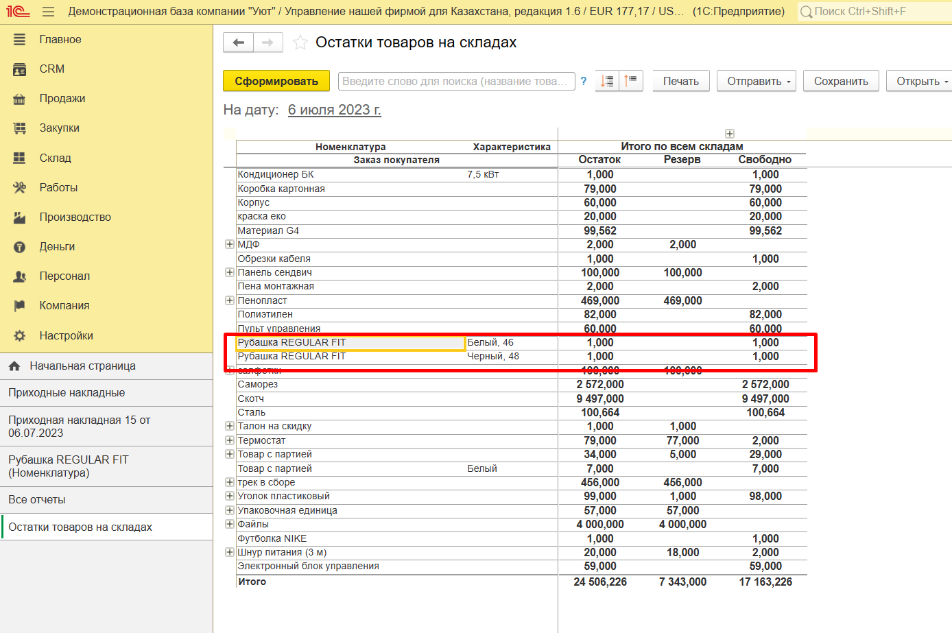 В отчете остатки товаров отображаются в разрезе характеристик.