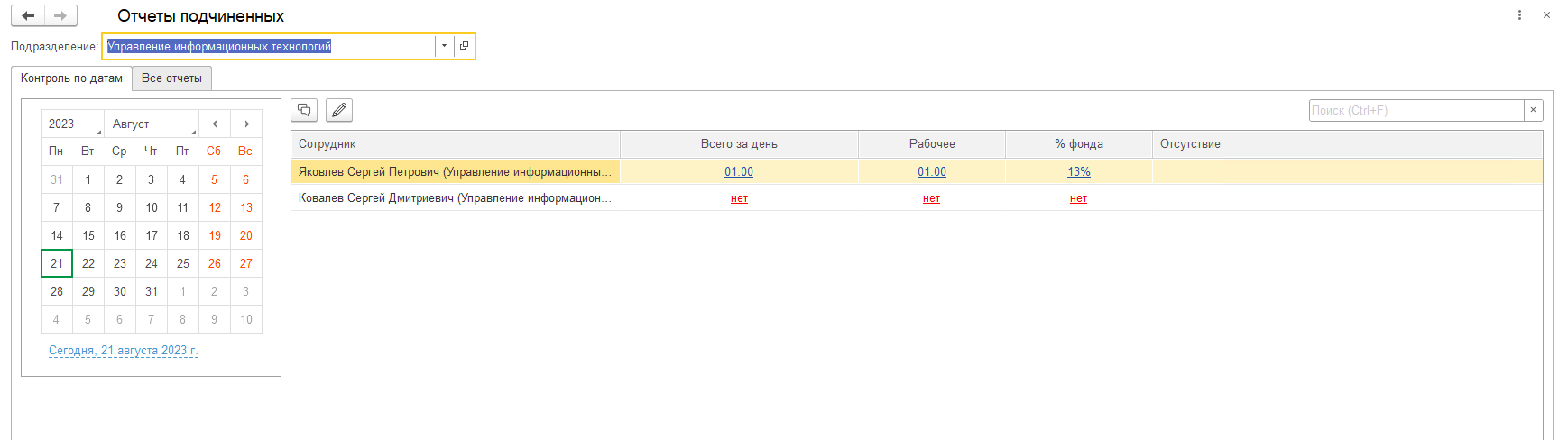 Программа предоставляет функцию ежедневной отчетности сотрудников. В этот отчет включены данные о времени, которое было затрачено на определенные проекты и виды работ. Отчетность также включает описание сущности выполняемой работы. Эта информация является ключевой для оценки эффективности труда сотрудников и анализа их рабочей нагрузки.