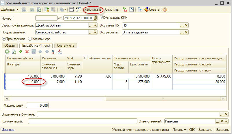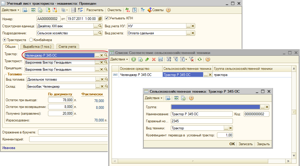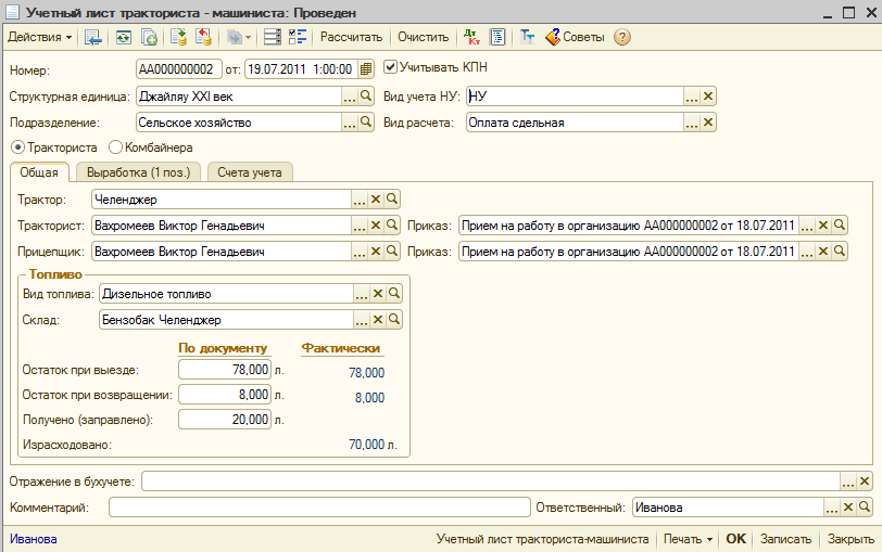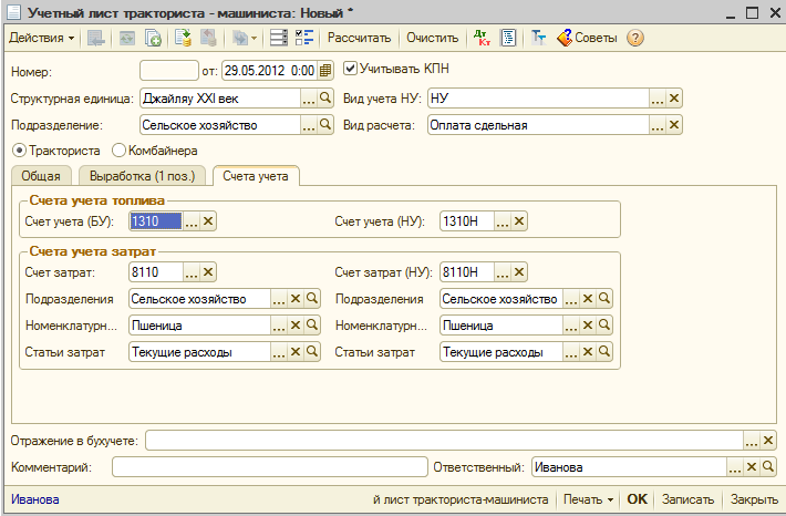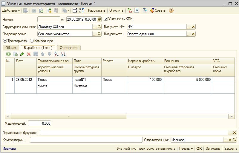 2. Как заполнить учетный лист тракториста в 1С: Бухгалтерия сельскохозяйственного предприятия