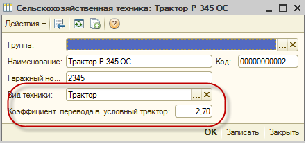Коэффициент перевода в условный трактор становится доступным для установки, если выбран вид техники "Трактор".