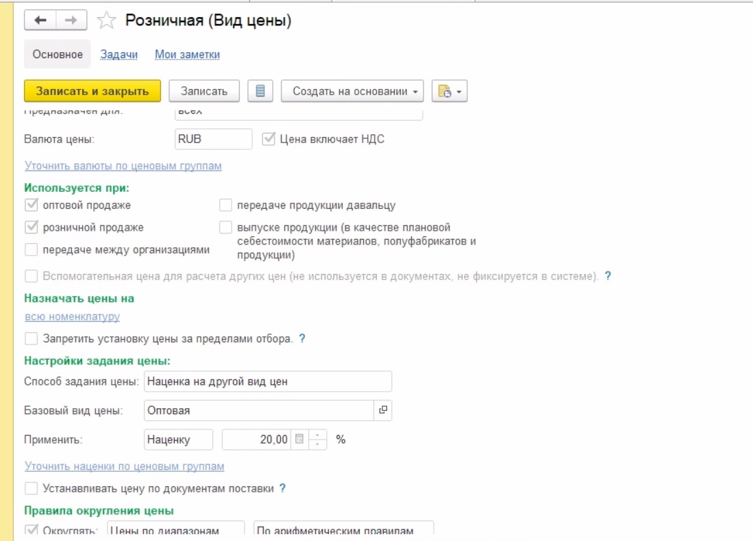 В конфигурации 1С: ERP для Казахстана есть возможно рассчитывать цены по настроенным правилам. Для настройки правил расчета цен используется справочник Виды цен. В виде цен есть следующие основные настройки: