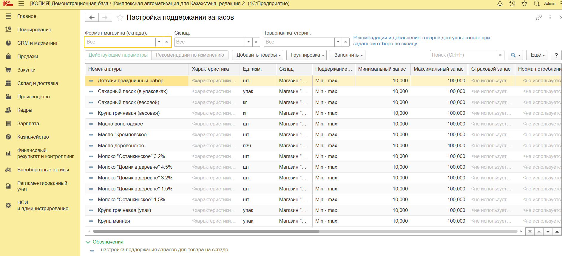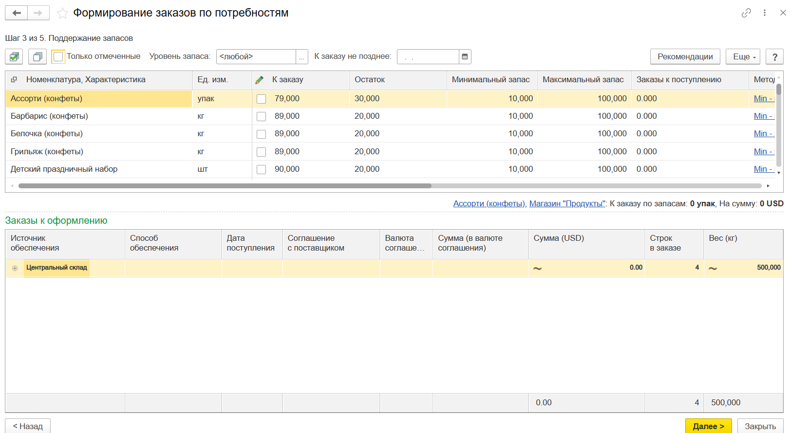 В программе есть возможность настроить поддержание запасов по статистике, по норме или по настройке min-max. С помощью данной настройки можно настроить автоматическое создание заказов поставщику по потребностям склада.