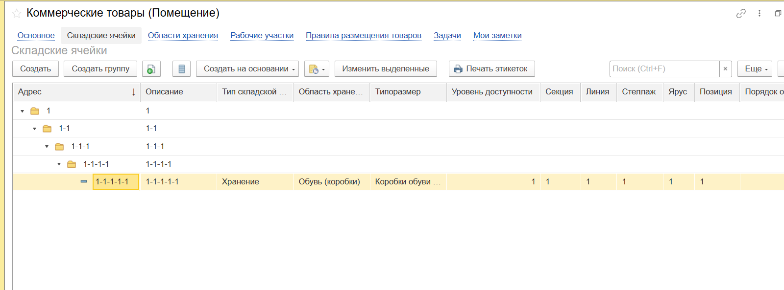 В настройках подсистемы склада также есть возможность включить адресную систему хранения. Адресное хранение в 1С позволяет использовать помещения и ячейки склада. Это позволяет более гибко и оперативно управлять складом. Ячейки можно настроить через карточку склада.