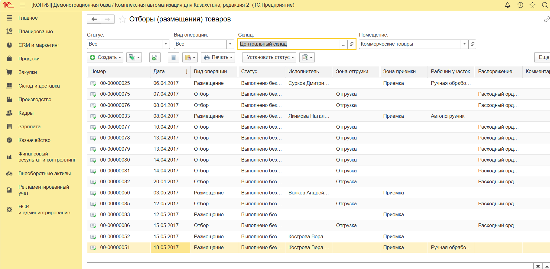 Движение товаров по складским ячейкам регистрируется с помощью документа Отбор (размещение) товара.