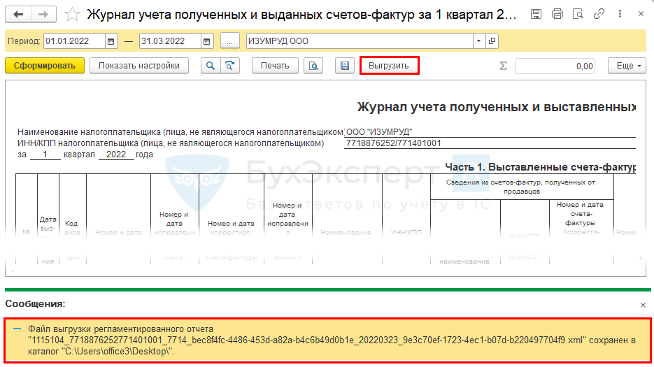 Чтобы отправить результаты журнала счетов-фактур 1С 8.3 – нужно кликнуть на «Выгрузить», как можно увидеть далее: