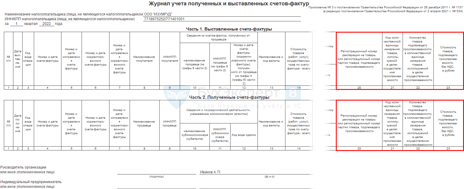 Далее, внутри журнала учёта по счетам-фактурам 1С 8.3 можно будет проследить отображение всех изменений, которые мы внесли раннее, как показано ниже: