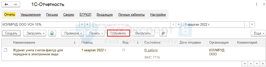 Когда в журнал были внесены все необходимые данные – его можно увидеть, если выбрать вкладку «Отчёты» и перейти на панель «Регламентированные отчёты», тут же можно отправлять журнал счетов-фактур 1С 8.3:
