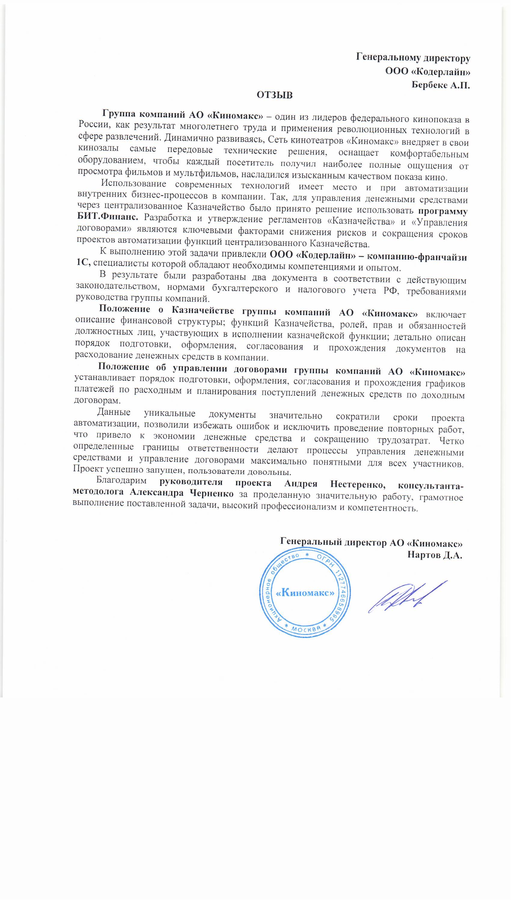 Положение о Казначействе группы компаний АО «Киномакс» включает описание финансовой структуры; функций Казначейства, ролей, прав и обязанностей должностных лиц, участвующих в исполнении казначейской функции; детально описан порядок подготовки, оформления, согласования и прохождения документов на расходование денежных средств в компании.