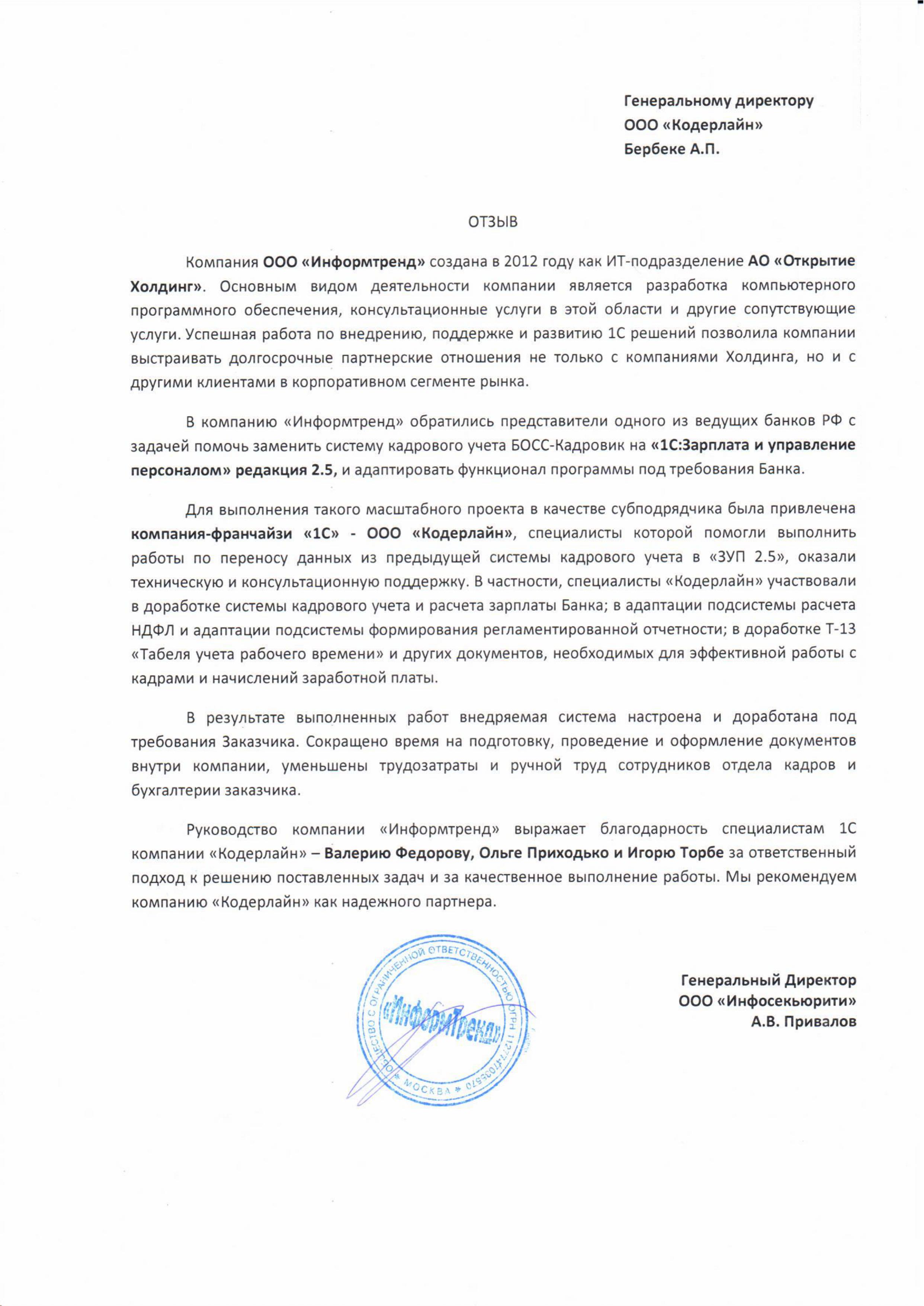 Руководство компании «Информтренд» выражает благодарность специалистам 1С компании «Кодерлайн» – Валерию Федорову, Ольге Приходько и Игорю Торбе за ответственный подход к решению поставленных задач и качественно выполненные работы. Мы рекомендуем компанию «Кодерлайн» как надежного партнера.
